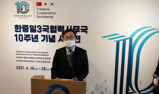 在開幕式致辭中,邢海明強調,中日韓三國是一衣帶水的近鄰,三國間的合作對于實現本國發展、保障地區和平與安全、推動世界繁榮具有重要意義。今年恰逢秘書處成立十周年,作為三國間的常設機構,秘書處為增進三國國民之間的相互理解和友好交流做出了積極貢獻。此次圖片展,正是秘書處十年來努力和成果縮影。