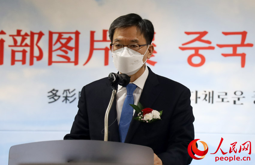 邢海明在圖片展開幕式上致辭。駐韓大使館供圖