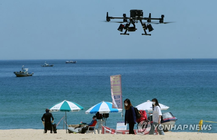 人民網訊 據韓聯社報道,6月4日,在韓國江原道江陵市一處海灘,一架搭載熱成像攝像機的無人機正在測量游客體溫。