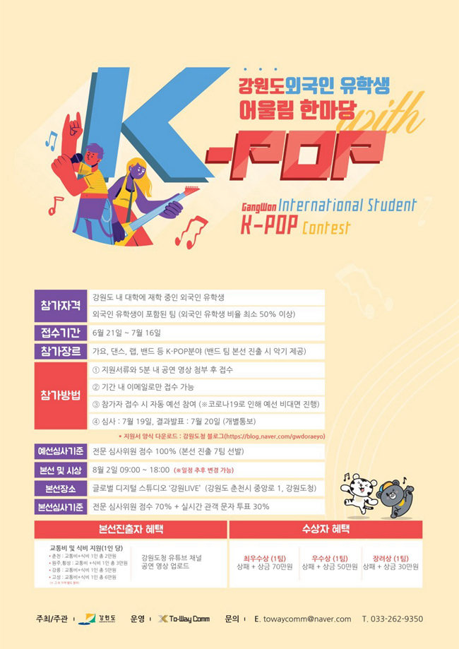 6月21日至7月16日,外國留學生K-POP大賽將進行線上招募和海選,比賽形式包括歌曲、舞蹈、rap、樂隊等。另外,韓國本土學生也可以加入留學生數量占比一半以上的樂隊參賽。