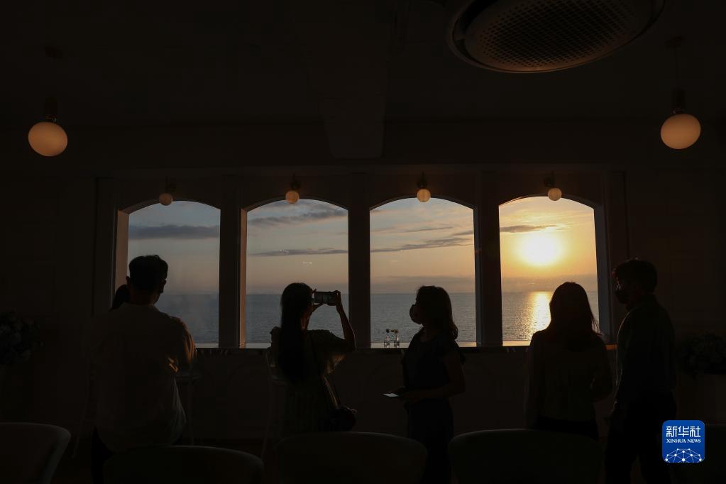 9月11日,人們在位于韓國仁川馬嘶鞍海灘的一家咖啡館欣賞落日余暉。