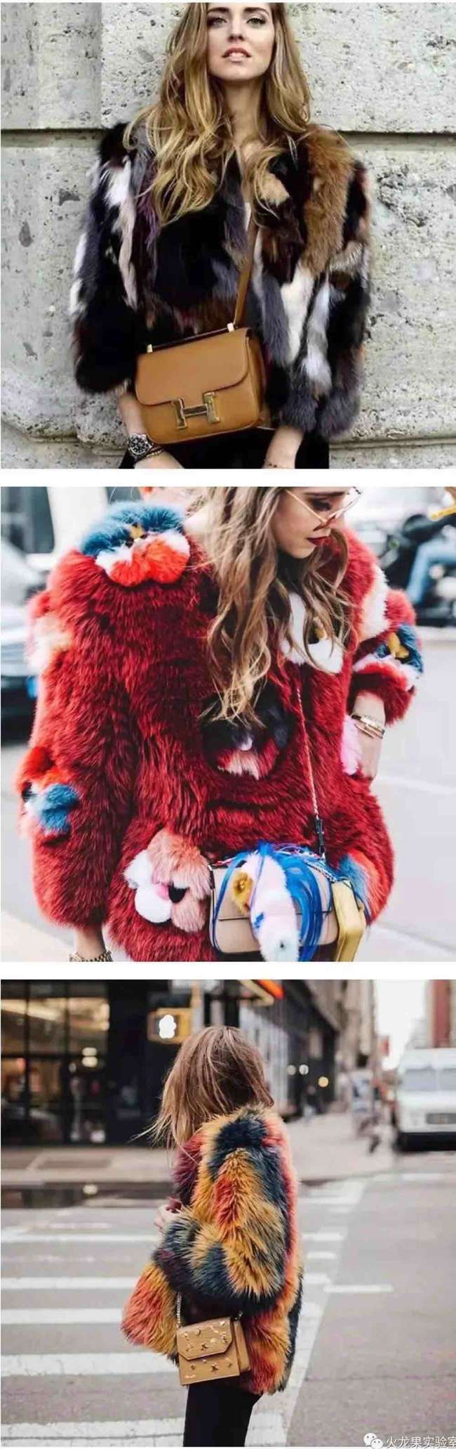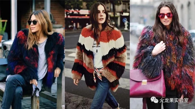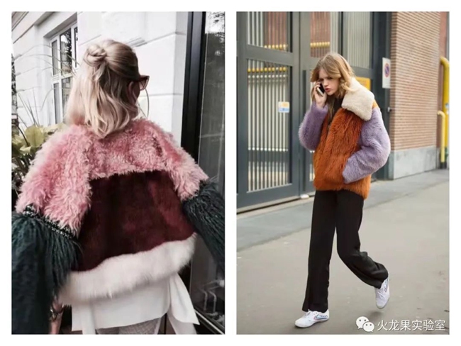 彩色皮草個性十足,充滿青春氣息。不論年齡大小,誰穿上都會是人群中最亮眼的那一個。如果將彩色拼接起來,效果會更加華麗、夸張,有一種一眼萬年的即視感。