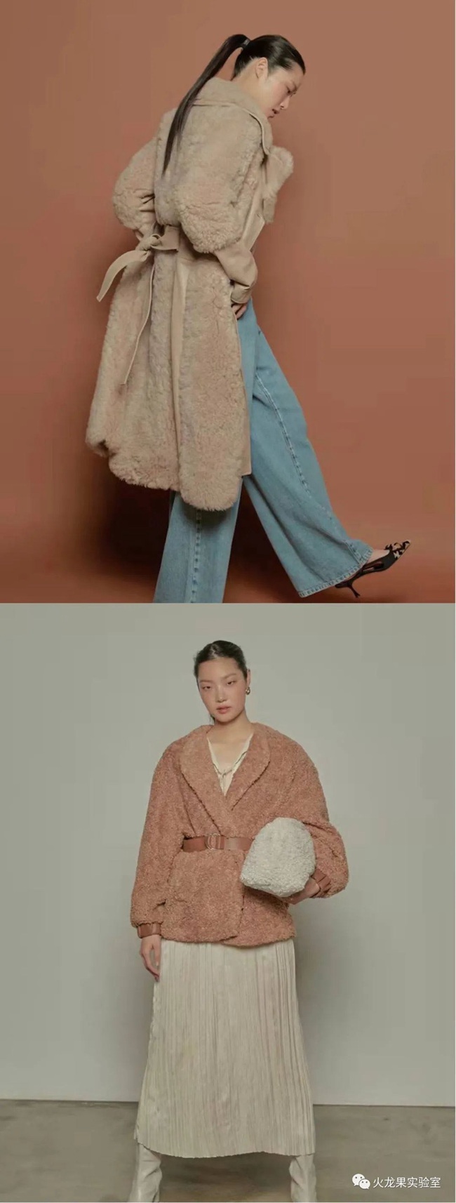 下面這兩件皮草,由大面積的柔和色塊幾何拼接而成,充滿了少女氣息,穿上就減齡。