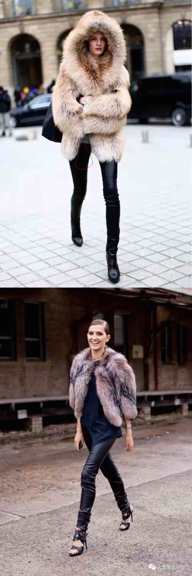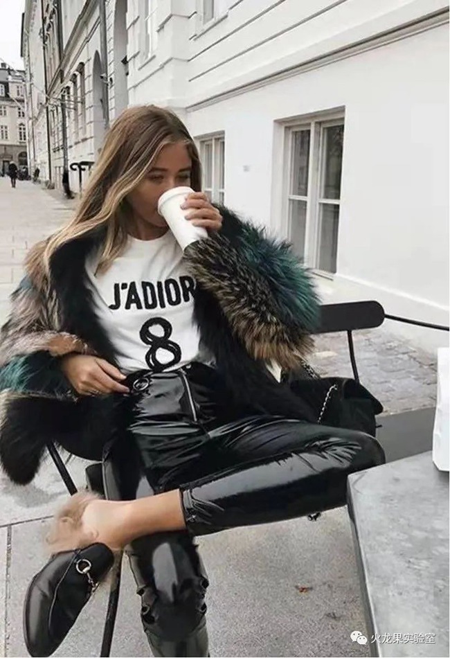 皮草和皮褲的組合非常經典,有一種“剛柔相濟”的感覺,是很多歐美小姐姐出街的最愛。皮褲如果是漆皮的,對比效果就會更夸張,讓人挪不開眼。