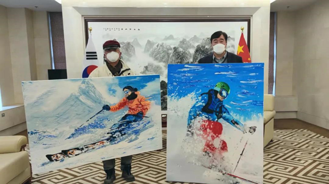 人民網首爾12月29日(周玉波 楊帆) 近日,韓國知名畫家、韓中美術協會會長車鴻圭向中國駐韓國大使館贈送了其繪制的兩幅冬奧主題繪畫作品,祝愿北京冬奧會取得圓滿成功。