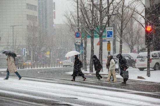 12月18日,在韓國首爾,行人在雪中過馬路。新華社記者王益亮攝