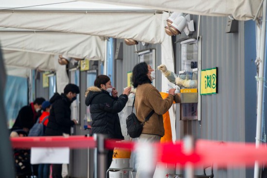 12月11日,在韓國首爾廣場新冠檢測點,民眾接受核酸采樣。新華社記者王益亮攝