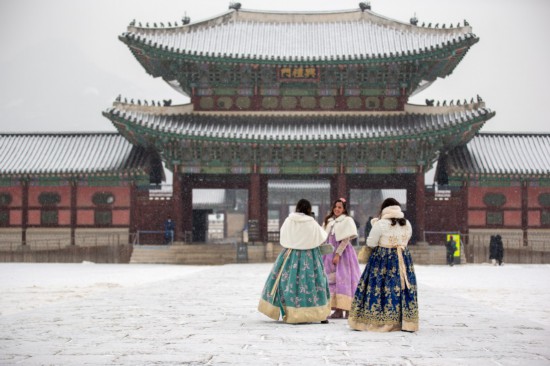 1月19日,在韓國首爾,游客在雪中游覽景福宮。(新華社記者王益亮攝)