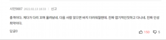 “受到沖擊。而且還蹺著二郎腿放上去。下一個人坐的話褲子會臟的。 真是荒唐舉動,人品真差!