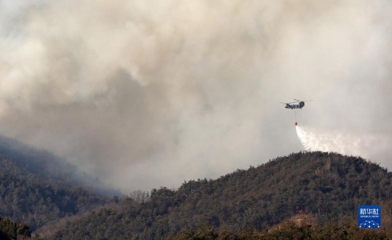 2月16日,直升機在韓國慶尚北道一處森林滅火。新華社/紐西斯通訊社