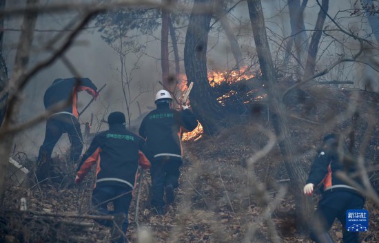 2月16日,救援人員在韓國慶尚北道一處森林滅火。新華社/紐西斯通訊社