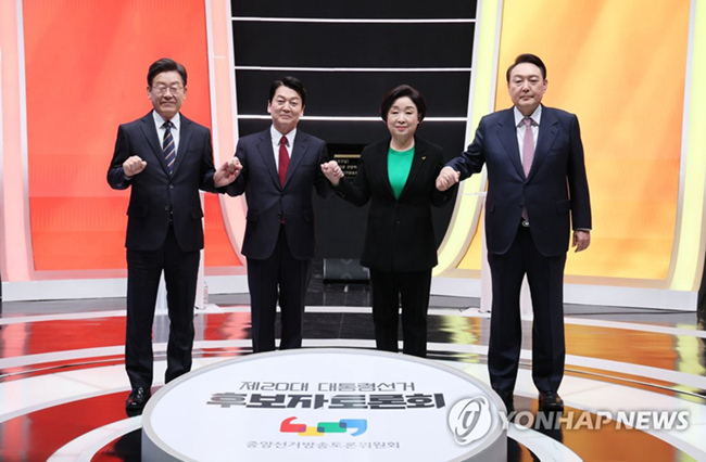 2月21日,在MBC電視臺,第20屆韓國總統選舉四大候選人舉行電視辯論會。圖為共同民主黨李在明、國民之黨安哲秀、正義黨沈相奵、國民力量尹錫悅(從左至右)在辯論開始前合影留念。圖源:韓聯社