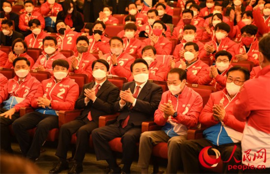 尹錫悅確認當選后,在國民力量黨第20屆總統選舉開票情況監測室現場。人民網 裴埈基攝