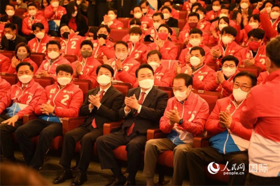 2022年3月10日,尹錫悅確認當選后,在國民力量黨第20屆總統選舉開票情況監測室現場。人民網 裴埈基攝