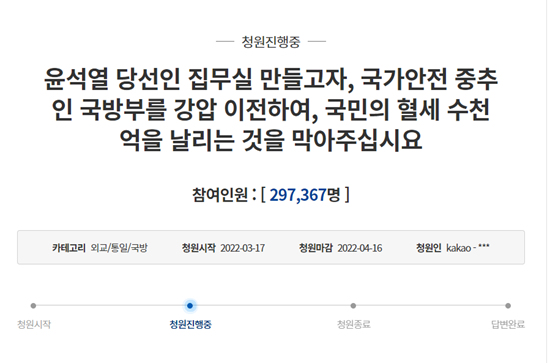 3月17日,韓國網民在總統府青瓦臺官網問政平臺發起反對候任總統尹錫悅將第二十屆總統辦公室從青瓦臺遷往龍山的請愿。截至當地時間3月21日上午10時15分,已有近30萬人參與請愿,參與人數達到主管部門答復標準。目前,韓國現政府是否會對下屆政府的爭議政策表態,備受各界關注。