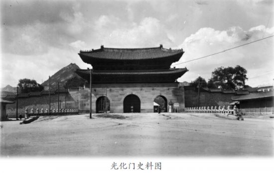光化門始建于1395年,一開始被命名為“四正門”。1425年更名“光化門”,乃“光照四方,教化四方”之意。1592年壬辰倭亂,豐臣秀吉侵略朝鮮半島,光化門被日軍焚毀。此后,直到1865年,光化門才得以重建。1910年,日本伊藤博文政府迫使朝鮮政府簽訂了《日韓合并條約》,正式吞并朝鮮半島。1926年,日本殖民者為修建朝鮮總督府,由于嫌光化門“礙事”,一度想完全拆毀光化門。但此后朝鮮內部甚至日本國內發起反對拆除運動,最后光化門被遷移到景福宮東門建春門北側。