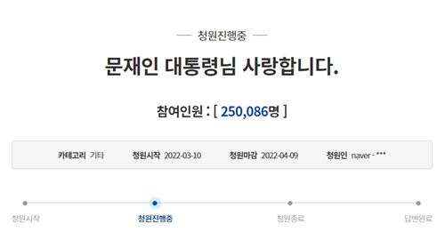 《國民日報》報道稱,3月10日,韓國網民在總統府青瓦臺官網問政平臺發起題為“文在寅總統,我們愛戴您”的請愿文。截至當地時間3月23日下午1時25分,已有超25萬人參與請愿,參與人數達到主管部門答復標準。