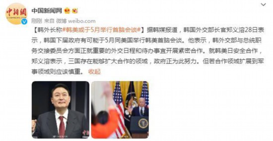 據韓媒報道,韓國外交部長官鄭義溶28日表示,韓國下屆政府有可能于5月同美國舉行韓美首腦會談。他表示,韓外交部與總統職務交接委員會方面正就重要的外交日程和待辦事宜開展緊密合作。就韓美日安全合作,鄭義溶表示,三國存在能夠擴大合作的領域,政府正為此努力。但若合作領域擴展到軍事領域則應該慎重。