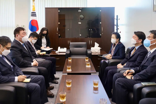 4月6日,中國駐韓國大使邢海明會見韓國總統職務交接委員會委員長安哲秀。中國駐韓國大使館供圖