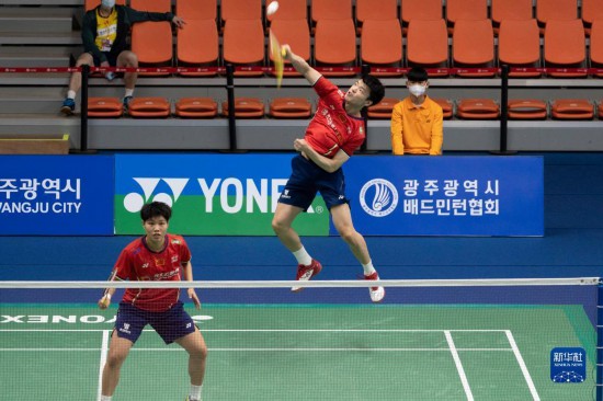 4月12日,在韓國光州市舉行的韓國羽毛球大師賽混雙首輪比賽中,中國組合王懿律/黃東萍以2比1戰勝隊友郭新娃/劉玄炫,晉級下一輪。