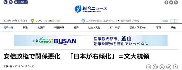 【環球網報道】韓聯社日語版27日報道,韓國JTBC電視臺26日播出即將卸任的韓國總統文在寅采訪內容,在采訪中他談及日本前首相安倍晉三,并表示,“安倍政府時期,韓日關系惡化,日本右傾化發展,這很明顯!