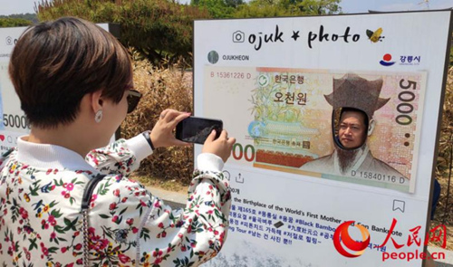 在江原道江陵市烏竹軒旅游景區,兩名外國游客正在拍照區打卡。人民網 裴埈基攝