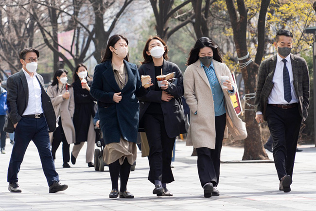 3月16日,人們佩戴口罩走在韓國首爾街頭。新華社發(李相浩攝)
