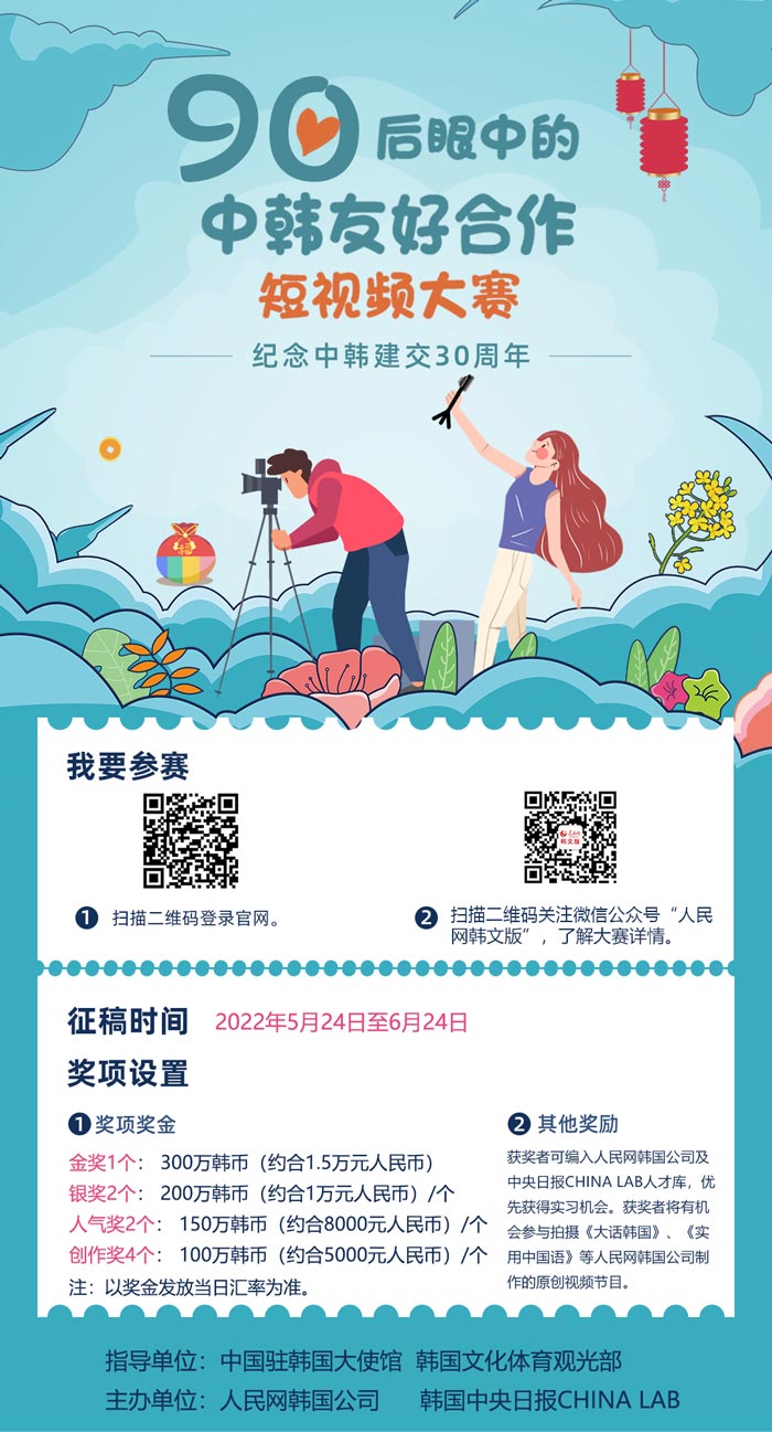 現在,有一個機會能讓你的真知灼見大放異彩!“90后眼中的中韓友好合作”短視頻大賽啟動倒計時!本次大賽由中國駐韓國大使館、韓國文化體育觀光部指導,人民網韓國公司與韓國中央日報CHINA LAB聯合主辦。金獎獎金1.5萬元!銀獎獎金1萬元!人氣獎和創作獎同樣獎金豐厚!是時候用作品證明你的才華了!我們誠摯邀請所有中韓90后參賽,只要你有創意、敢表達,你就能成為下一個中韓年輕人中的意見領袖。