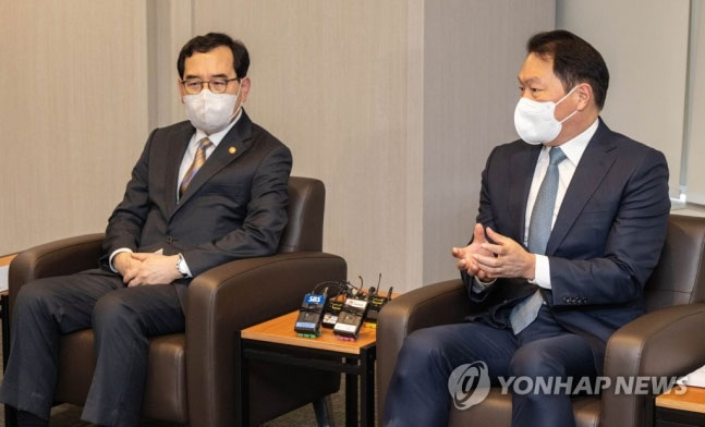 韓國產業通商資源部部長李昌洋(左)與韓國大韓商工會議所會長崔泰源正在進行會談。圖源:韓聯社