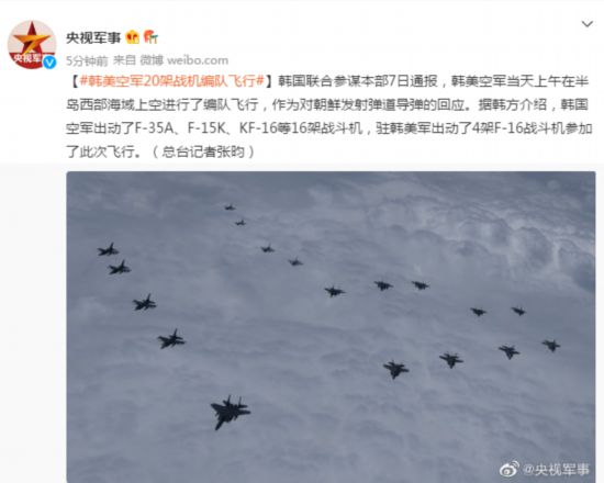 韓國聯合參謀本部7日通報,韓美空軍當天上午在半島西部海域上空進行了編隊飛行,作為對朝鮮發射彈道導彈的回應。據韓方介紹,韓國空軍出動了F-35A、F-15K、KF-16等16架戰斗機,駐韓美軍出動了4架F-16戰斗機參加了此次飛行。(總臺記者張昀)