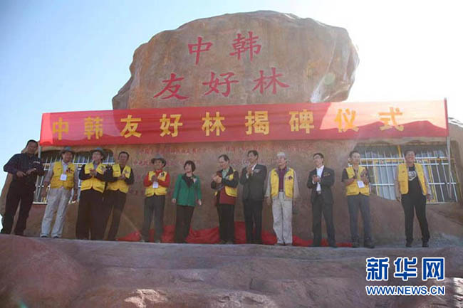 2014年10月,黃有福(右四)等人在寧夏靈武市白芨灘國家級自然保護區舉行了“中韓友好林”揭碑儀式。(受訪者供圖)