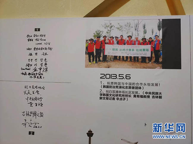 在寧夏靈武市白芨灘全國防沙治沙展覽館,展覽著韓國防治荒漠化志愿者團體2013年參加友好植樹活動時的親筆留言。(新華社記者謝建雯攝)