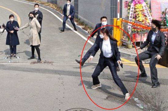 當時,該女保鏢發現有人打算朝樸槿惠扔東西后,立馬張開雙手攔截,同時飛身一躍試圖攔截。其間她一直死死盯著酒瓶,確認酒瓶在自己腳前落地后,轉身向樸槿惠跑去。