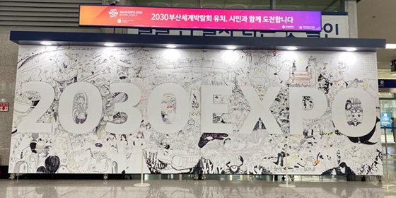 釜山市在火車站人流量較大區域打造了一個拍照區。拍照區墻面上印著“請大家為釜山申辦世博會助威!”的宣傳標語,以及釜山各個代表性景點的漫畫形象。