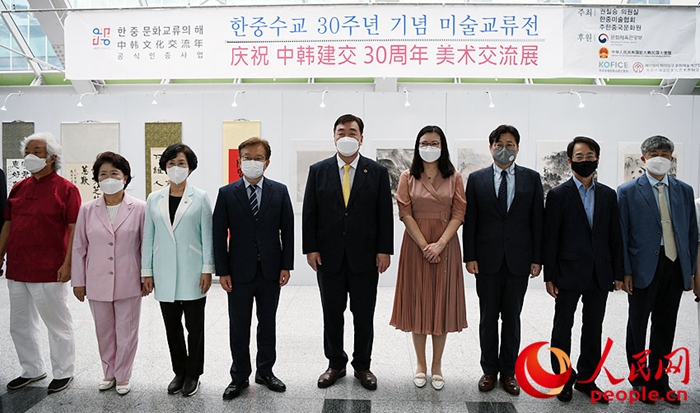 “慶祝中韓建交30周年美術交流展”開幕式嘉賓合影。人民網 裴埈基攝