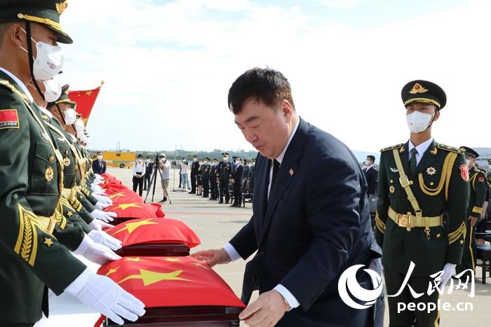 中國駐韓國大使邢海明為志愿軍烈士棺槨覆蓋國旗。人民網記者 張悅攝