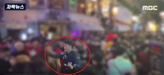 韓國警察站在高處疏散人群。(MBC電視臺)