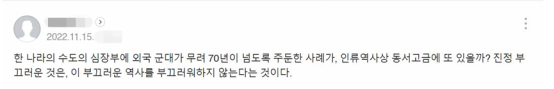 還有人對駐韓美軍基地持反對立場,寫道:“外國軍隊在一個國家首都的中心地帶駐軍超過70年,請問這種事情古今中外還會再有嗎?最讓人感到羞愧的是,有人對這種令人蒙羞的歷史一點都不感到羞愧!”↓