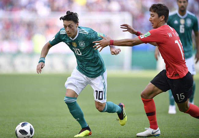 資料圖:這是2018年6月27日,在俄羅斯世界杯小組賽中,韓國隊球員鄭又榮(右)與德國隊球員厄齊爾拼搶。新華社記者陳益宸攝