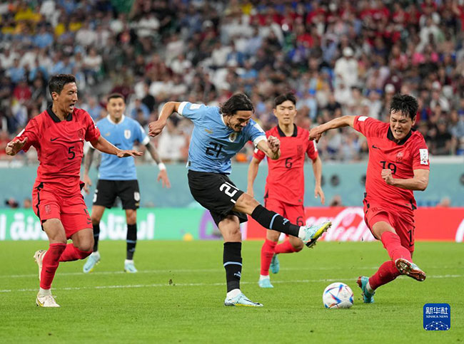 11月24日,烏拉圭隊球員埃丁森·卡瓦尼(中)射門。新華社記者 鄭煥松 攝