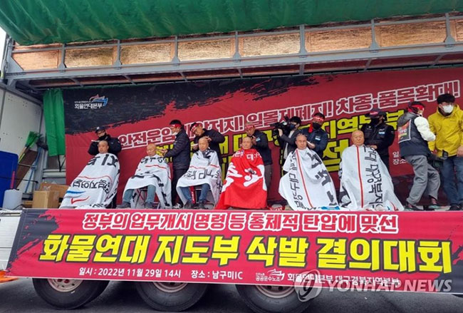 貨車司機們正在削發抗議。 圖片源自韓聯社