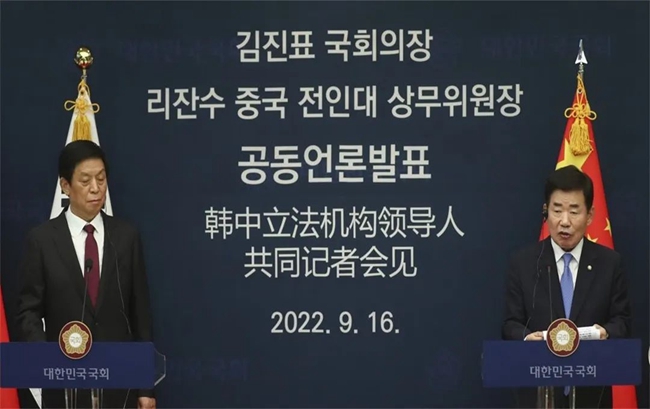2022年9月15日至17日,應韓國國會議長金振杓邀請,中國全國人大常委會委員長栗戰書對韓國進行正式友好訪問。栗戰書委員長同韓國總統尹錫悅、國會議長金振杓進行深入溝通,商定加強包括立法機構在內的各渠道溝通交流,把握大勢,排除干擾,聚焦合作,夯實友好,共同推動中韓關系行穩致遠,更好造福兩國和兩國人民。