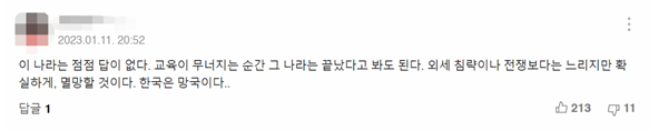 另一名網友悲觀地表示:“這個國家越來越無解了。教育崩潰的瞬間,就是國家滅亡的時刻。這樣消亡雖然比外族侵略或發生戰爭來得慢些,但可以確定的是,韓國是要亡國了!薄
