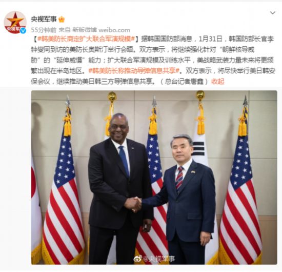 據韓國國防部消息,1月31日,韓國防部長官李鐘燮同到訪的美防長奧斯汀舉行會晤。雙方表示,將繼續強化針對“朝鮮核導威脅”的“延伸威懾”能力;擴大聯合軍演規模及訓練水平,美戰略武裝力量未來將更頻繁出現在半島地區。雙方表示,將盡快舉行美日韓安保會議,繼續推動美日韓三方導彈信息共享。(總臺記者唐鑫)