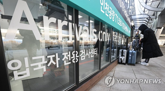 1月9日,在仁川國際機場第一航站樓,自華入境人員前往新冠檢測中心。圖源:韓聯社