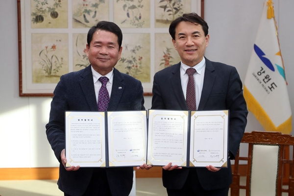 簽約儀式上,江原道道知事兼2023森博會組委會委員長金鎮臺(右一)與江原道教育廳教育監申慶浩合影留念。江原道供圖