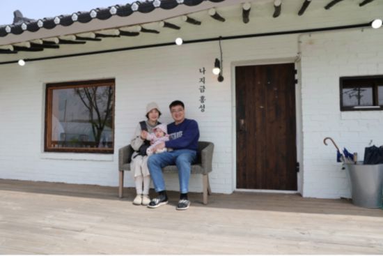 到忠清南道洪城郡農村開咖啡屋的韓國青年李泰昈,和家人在咖啡屋前“曬幸!。 張悅攝
