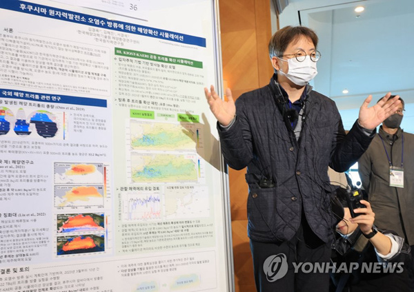 2月16日,韓國海洋科學技術院海洋環境研究中心首席研究員金景沃(音)介紹福島核污水排海影響研究結果。 圖源:韓聯社