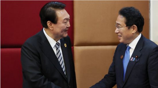 尹錫悅(左)與岸田文雄(右)于2022年11月在柬埔寨金邊出席活動期間會面。圖源:韓媒