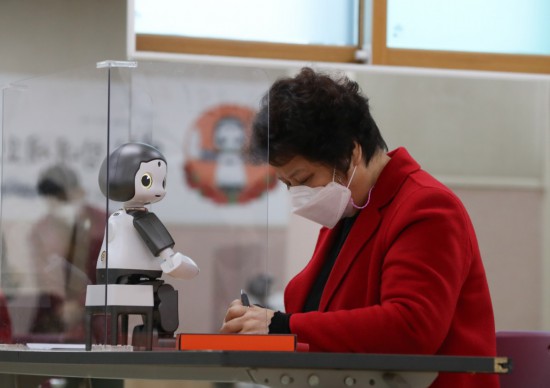2020年11月16日,一名老人在韓國首爾陽川區一處老年福利文化中心利用數碼教學機器人“LIKU”學習智能手機使用技能。新華社記者王婧嬙攝